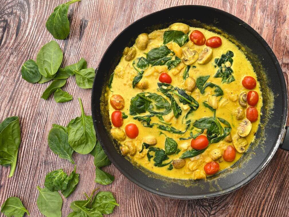 Curry suave con pescado blanco, espinacas, champis y tomatitos cherry. El curry es una mezcla de especias molidas, que en la India llaman ‘masala’ y