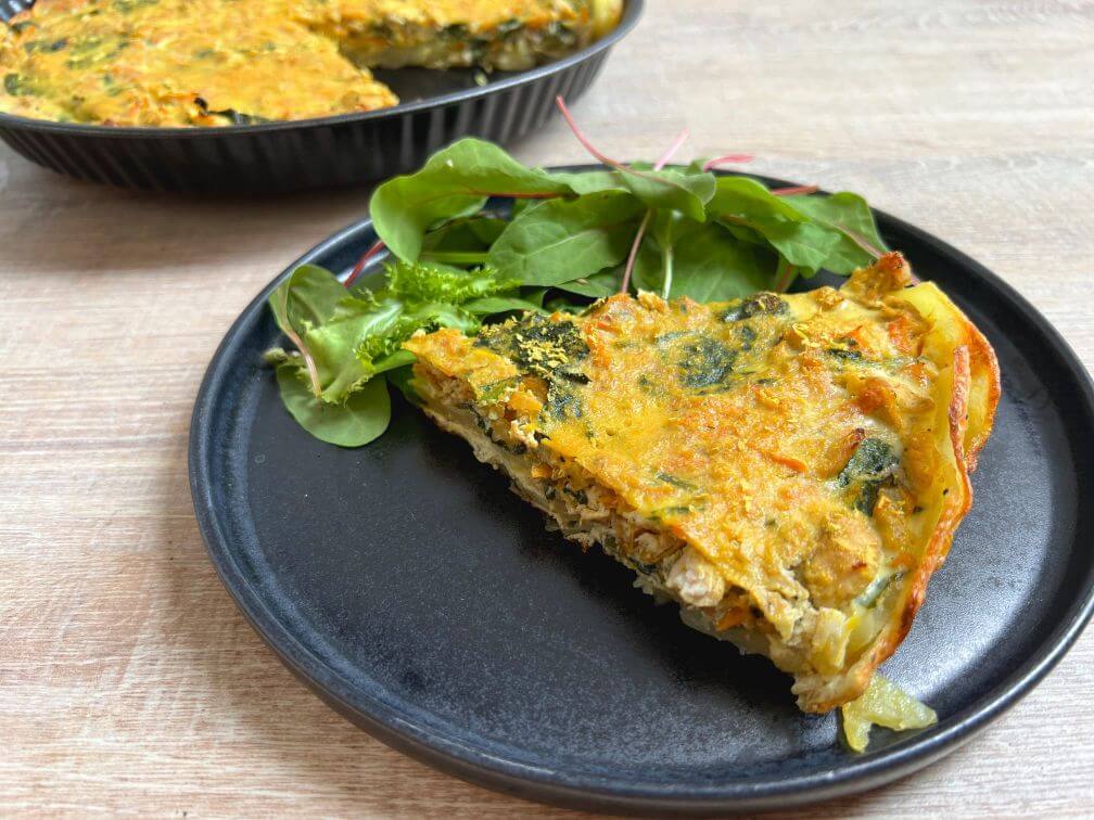Patrocinado por: ¡Deliciosa y nutritiva quiche sin harinas ni lácteos! La base es hecha de patatas laminadas y es más ligera que una tradicional de
