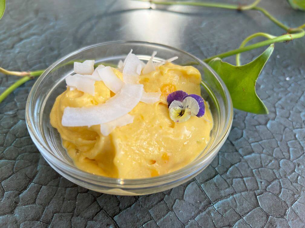 Delicioso helado casero sin lactosa ni azúcar refinado. La leche de coco y el mango maduro son bastante dulces, aunque puedes añadirle miel si deseas