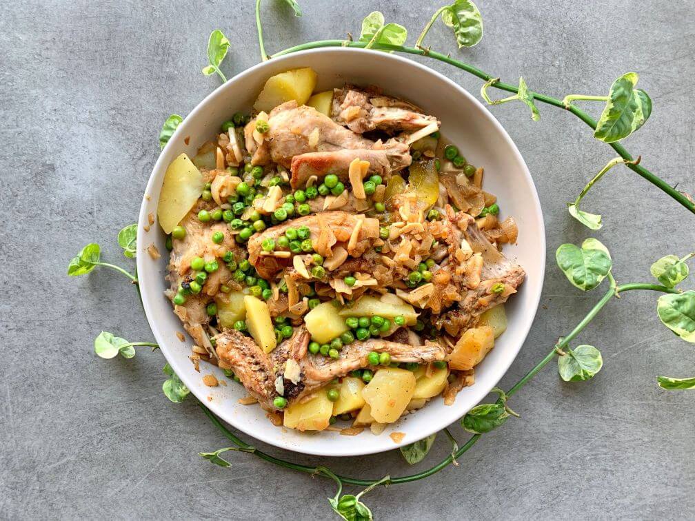 El conejo es un alimento muy sano y nutritivo. Su carne es rica en proteínas y baja en grasas. Combinada con los guisantes y la