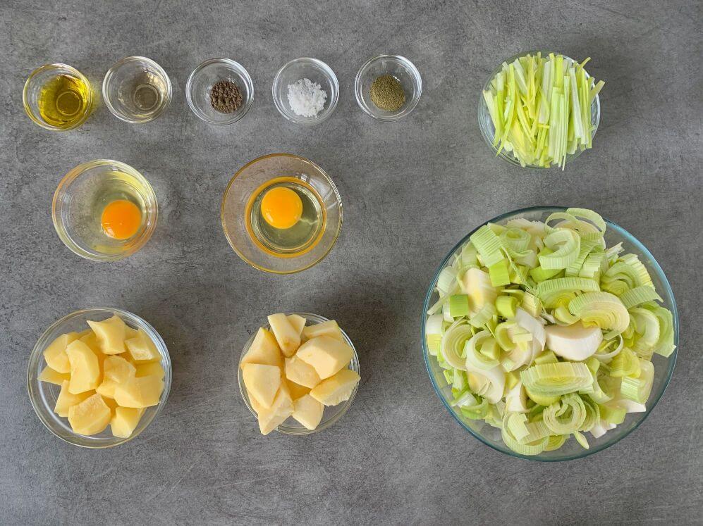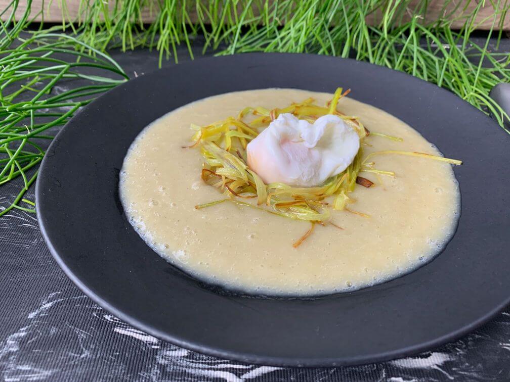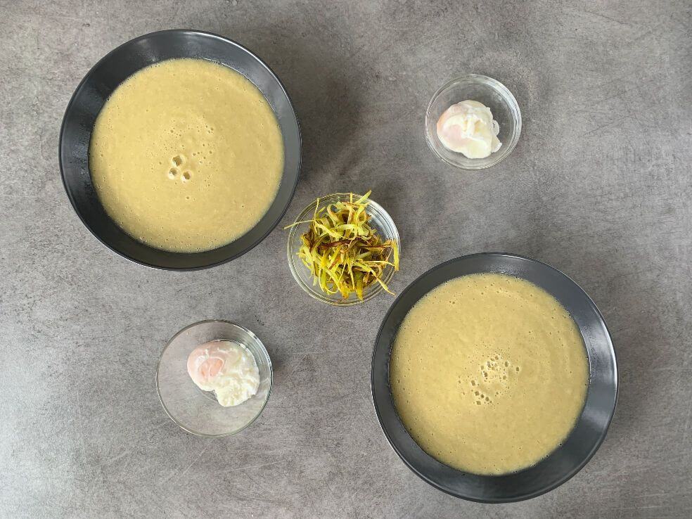 - Para montar el plato, sirve primero la crema, luego las tiritas de puerro y para acabar los huevitos.