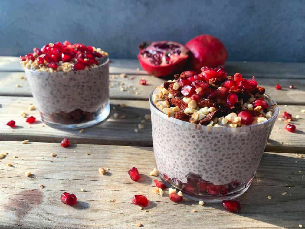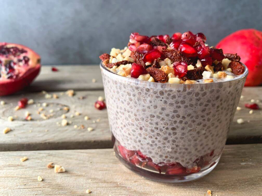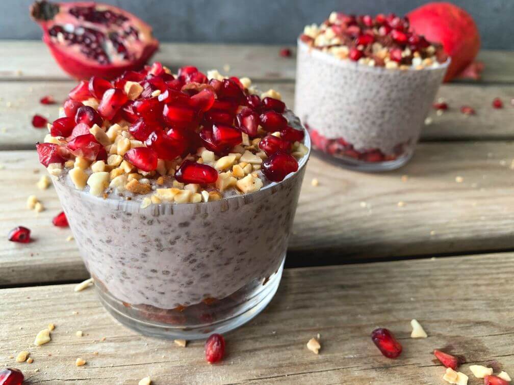 Con la llegada del otoño, nos llegan las granadas! Esta deliciosa fruta tiene pocas calorías, un bajo índice glucémico y nos aporta antioxidantes, vitamina C, potasio y ácido fólico. Así que las aprovecharemos para hacer el pudding de chía! Este es ideal para desayunar ya que es saciante y no tendremos antojos a media mañana, gracias a las semillas de chía, que además tienen alto contenido en fibra, antioxidantes y ácidos grasos (principalmente Omega 3), contienen 5 veces más calcio que la leche, dos veces más potasio que el plátano y 3 veces más hierro que las espinacas. Vamos que estas pequeñas semillas son un súper alimento!