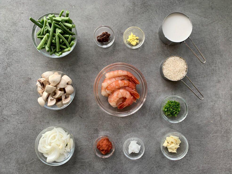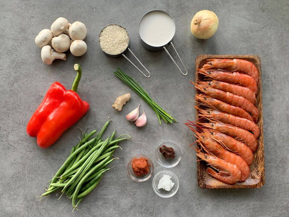 - Si has comprado las gambas enteras; cortar la cabeza a las gambas y pelar. Hacer un caldo sencillo con las pieles y cabezas, simplemente saltear 5 min con una cp de aceite de coco. Con un mortero chafar bien las cabezas y después, añadir 1 litro de agua. Cuando arranque el hervor salpimentar, tapar y cocinar a fuego medio por 20 minutos. Colar y reservar el caldo. (Si estás con energía puedes hacer primero un sofrito con tomate y cebolla