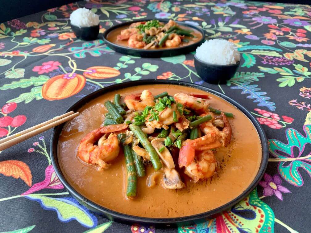 ¡Hoy una receta más exótica para 2 personas! No es la receta del curry original, pero es la que más me gusta y mejor me sienta! Lleva picante para darle sabor pero sin pasarse y muchas más verduras para que sea más equilibrado. Además, aprovechamos para hacer un caldo de marisco con las cabezas y pieles de las gambas, que puedes usar para una sopita a la noche o un arrocito el fin de semana.