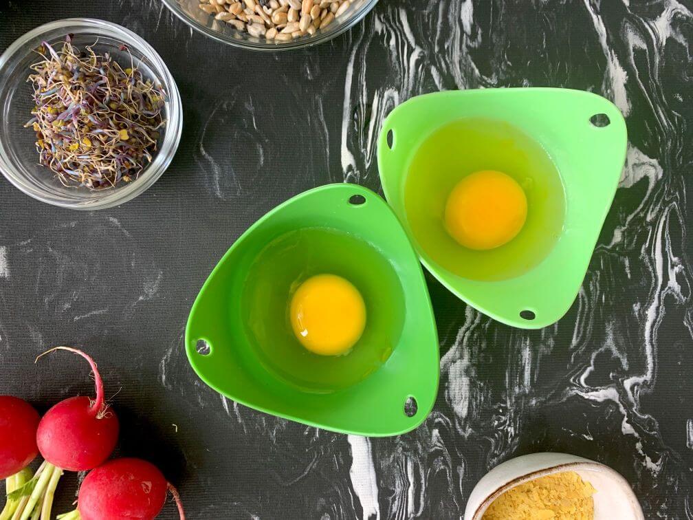 - Pon agua a hervir para hacer los huevos escalfados. Yo uso un molde de silicona para hacerlos porque así siempre me salen bien y no me gusta usar el papel film que es la otra alternativa para que siempre queden con la forma perfecta. He hecho una foto para que los veáis 😉 Hay que pincelar los moldes con un poco de aceite de oliva y luego echar el huevo descascado, una pizca de sal y alguna especie de tu agrado. Una vez haya hervido el agua, baja el fuego, introduce los moldes, tapa y cocina por 5 minutos. De esta forma quedan unos huevos poché perfectos, pero ajusta el tiempo a tu gusto.