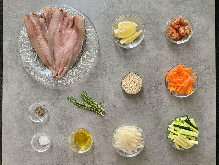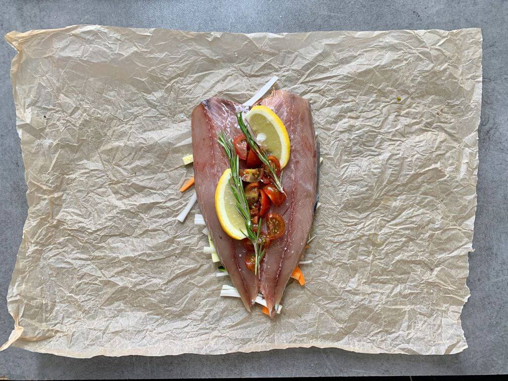 - En medio del papel pon las verduritas cortadas, salpimentalas y pon encima el filete de caballa, los tomate cherry, romero y rodajas de limón. Salpiméntalo y échale una cucharada de aceite.