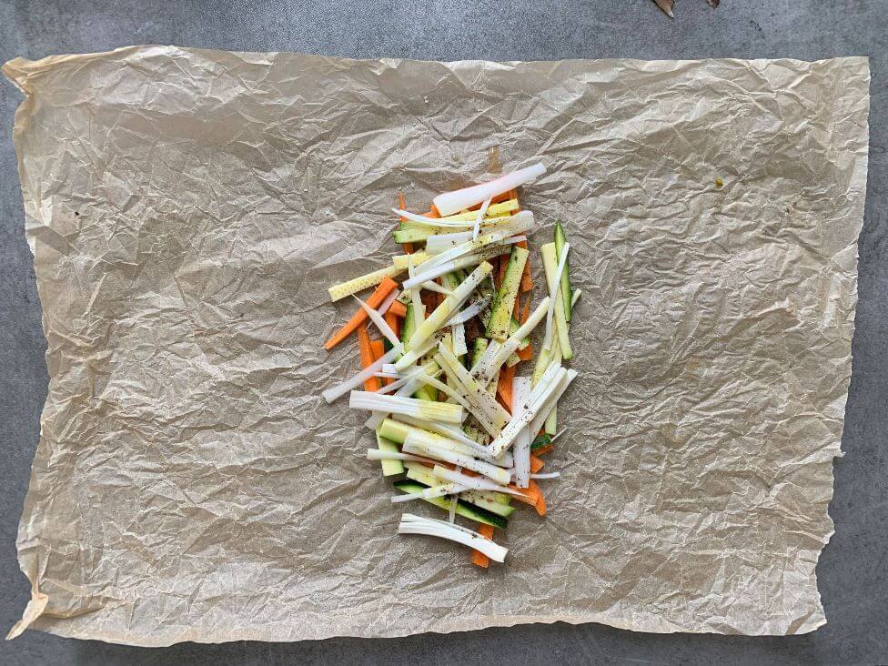 - Corta dos trozos de papel de horno suficientemente grandes como para que quepa el pescado y las verduras. También puedes usar papel de aluminio, bolsa de cocción o molde de silicona para cocción al vapor.