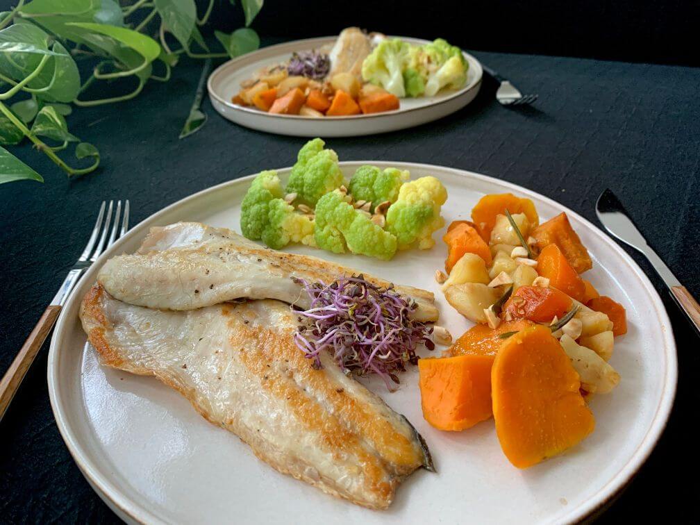 - Colocar los filetes de pescado y acompañar del brócoli, las verduras de raíz con la almendra laminada por encima, los germinados y un hilo de aceite.