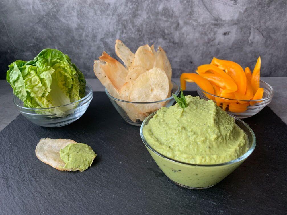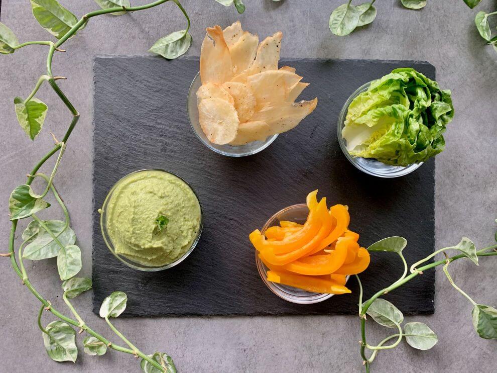- Sirve el hummus con los chips de yuca, tiras de pimiento amarillo (se repite menos que el rojo) y hojas de cogollo.