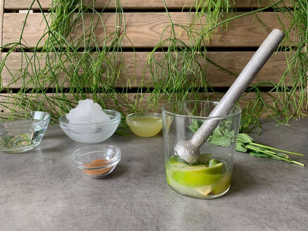 - Pon una lima en cada vaso y cháfalas con un mortero.