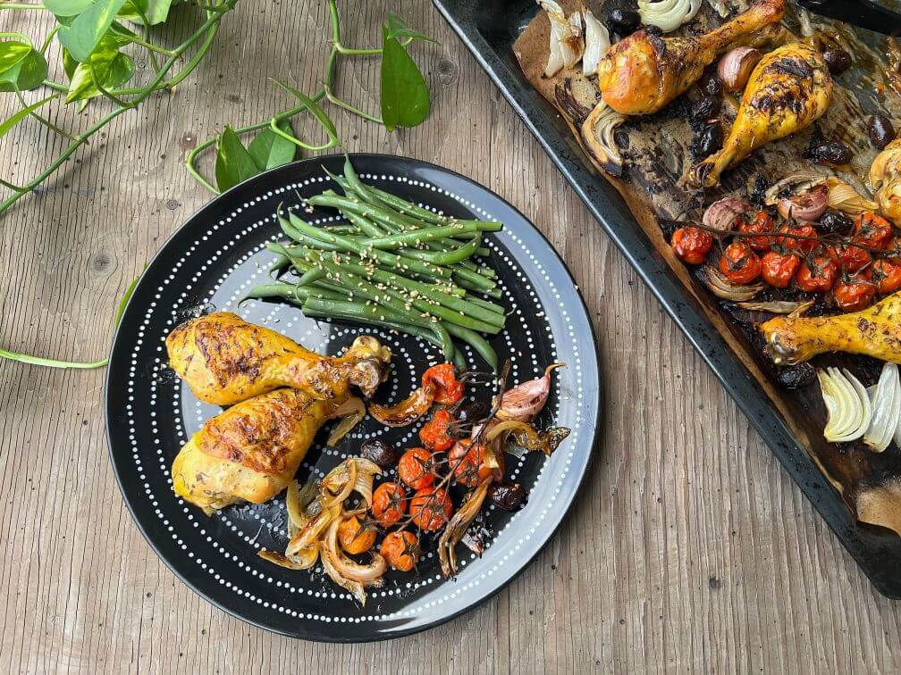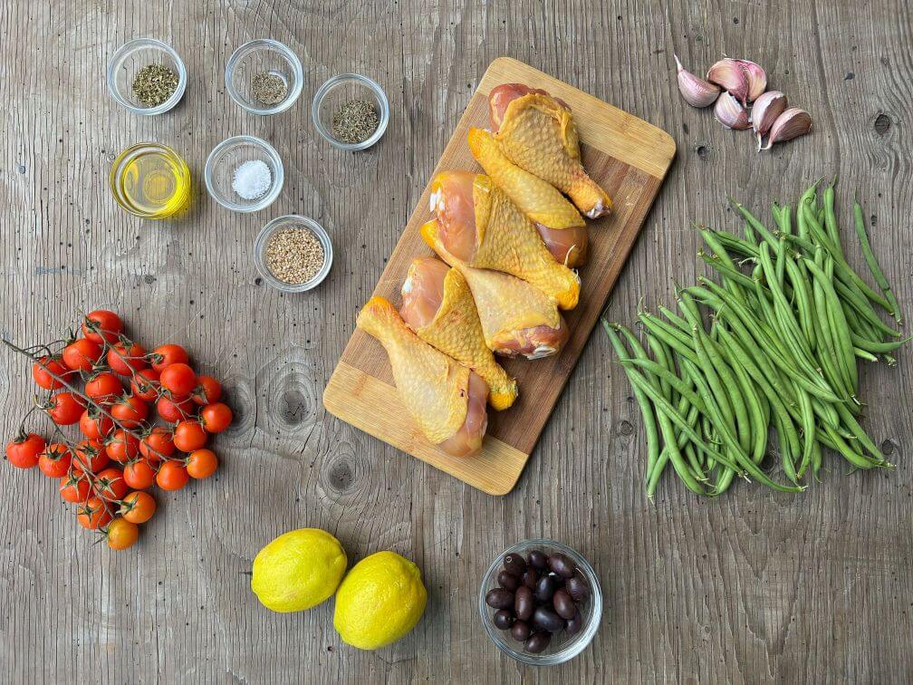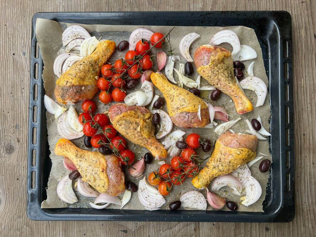 - Colócala en una bandeja para horno, junto con el pollo, tomates cherry (si no fueran cherry pártelos por la mitad), aceitunas y pollo.