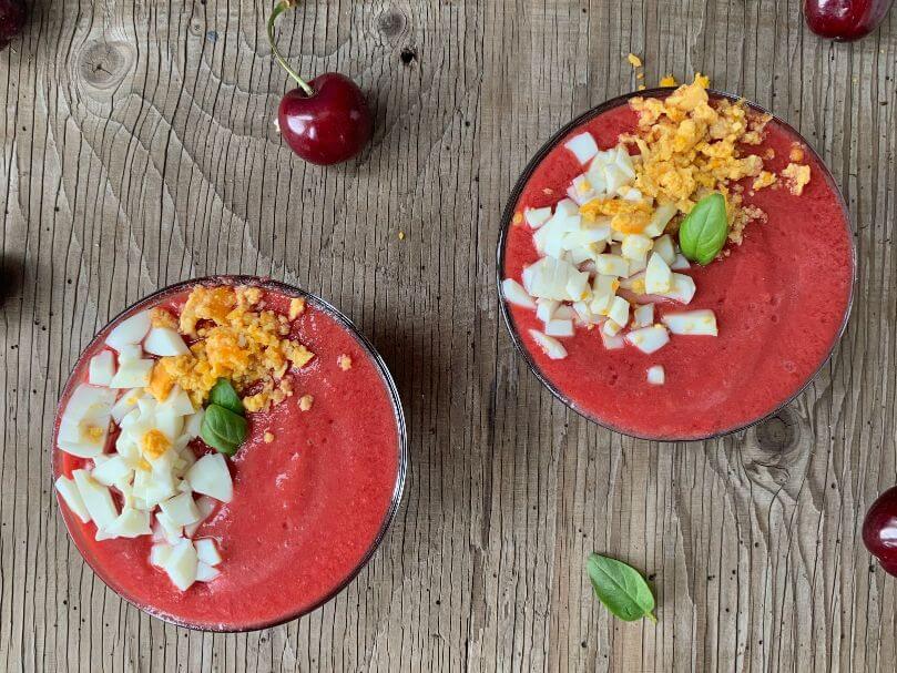 11. Sirve el salmorejo en dos vasos y encima medio huevo picado en cada vaso.