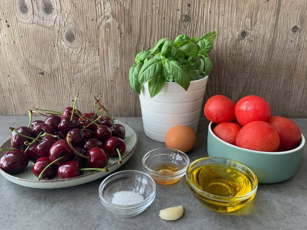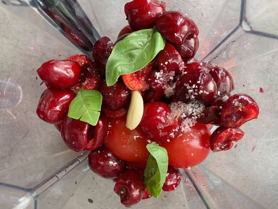 7. Pon las cerezas y tomates en el vaso de la batidora.