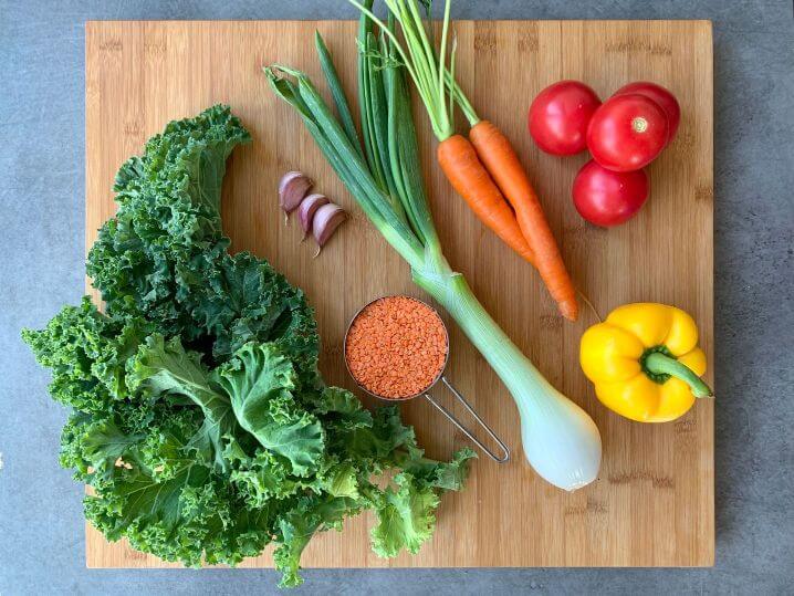 - Pasado este tiempo añadir la kale y volver a tapar. Cocinar por 5 minutos más o hasta que las lentejas y verduras estén hechas.