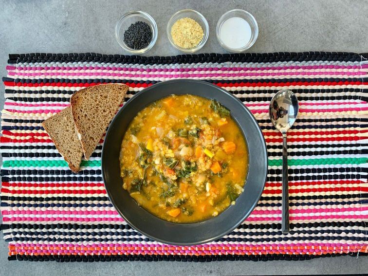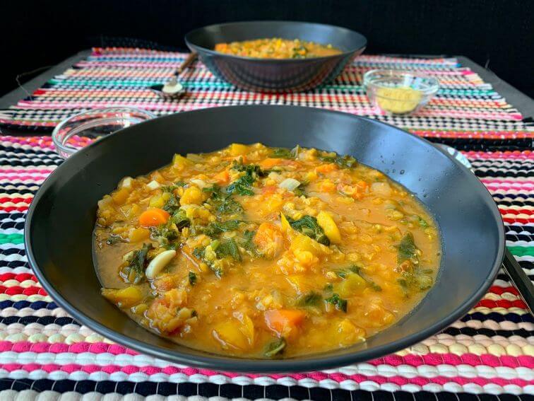 Esta sopa es muy reconfortante para comerla ahora en otoño o invierno. Las lentejas rojas son las más fáciles de digerir y no necesitan remojo. Además las que he usado son peladas y en grano por lo que todavía te sentarán mejor y se cocinan más rápido. Acompañada de un buen pan de centeno tendrás una comida completa y nutritiva.