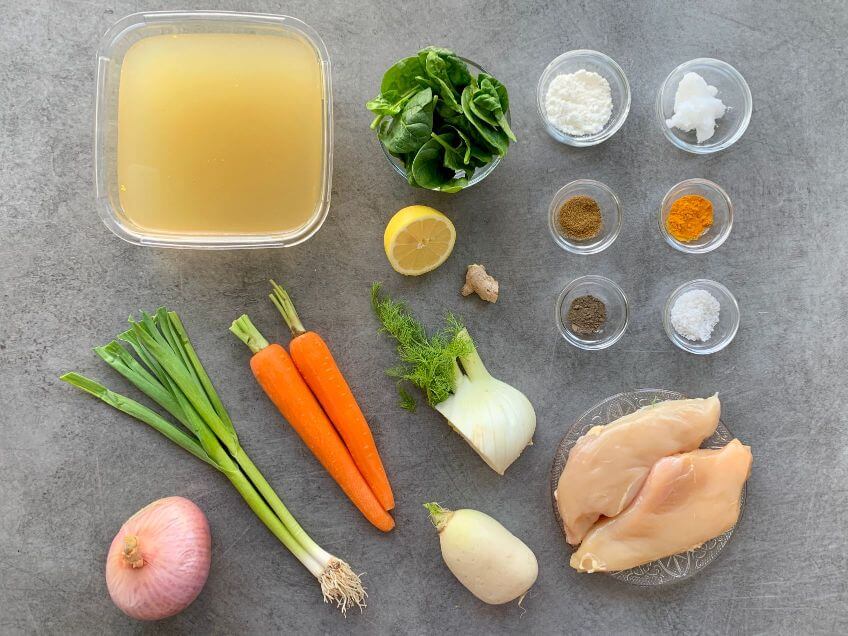 - Incorpora ahora la zanahoria, hinojo y nabo. Cocina por 5 minutos más y luego añade las especies en polvo, mezcla bien, adiciona el caldo de pollo y la leche de coco. Lleva a ebullición y luego reduce el fuego.