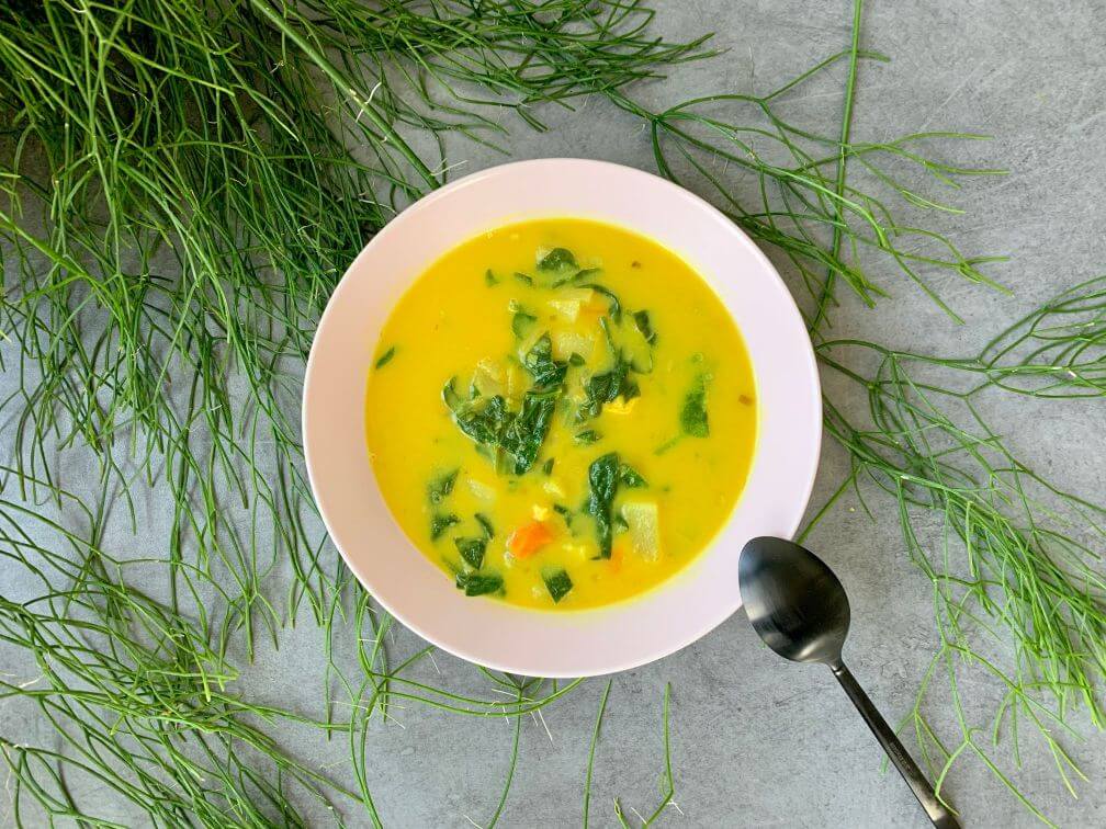 - Apaga el fuego, separa 1/4 de la sopa para batir y agrega las espinacas baby y el jugo de limón a la olla.
