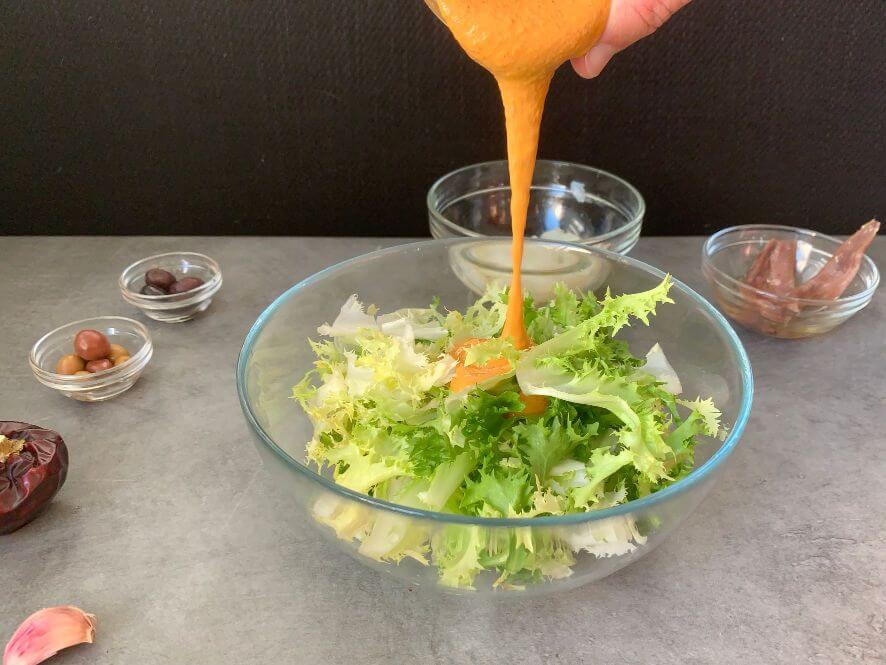 - Lava la escarola bien bajo el chorro de agua y luego déjala 10min en remojo con vinagre. Escurre bien y ponla en un bol, agrega un poco de la salsa y remueve bien que quede bien impregnada. Sino encuentras escarola, sustitúyela por otras hojas como lechuga, rúcula o endivias.