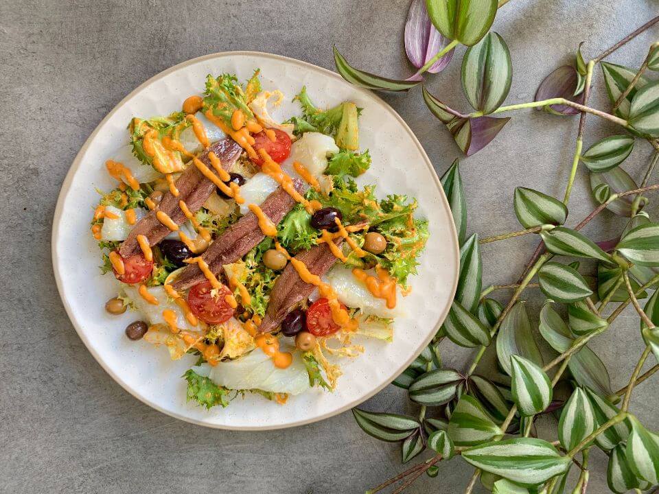 - Sirve la ensalada en el plato y distribuye los pescados, tomates y aceitunas por encima.