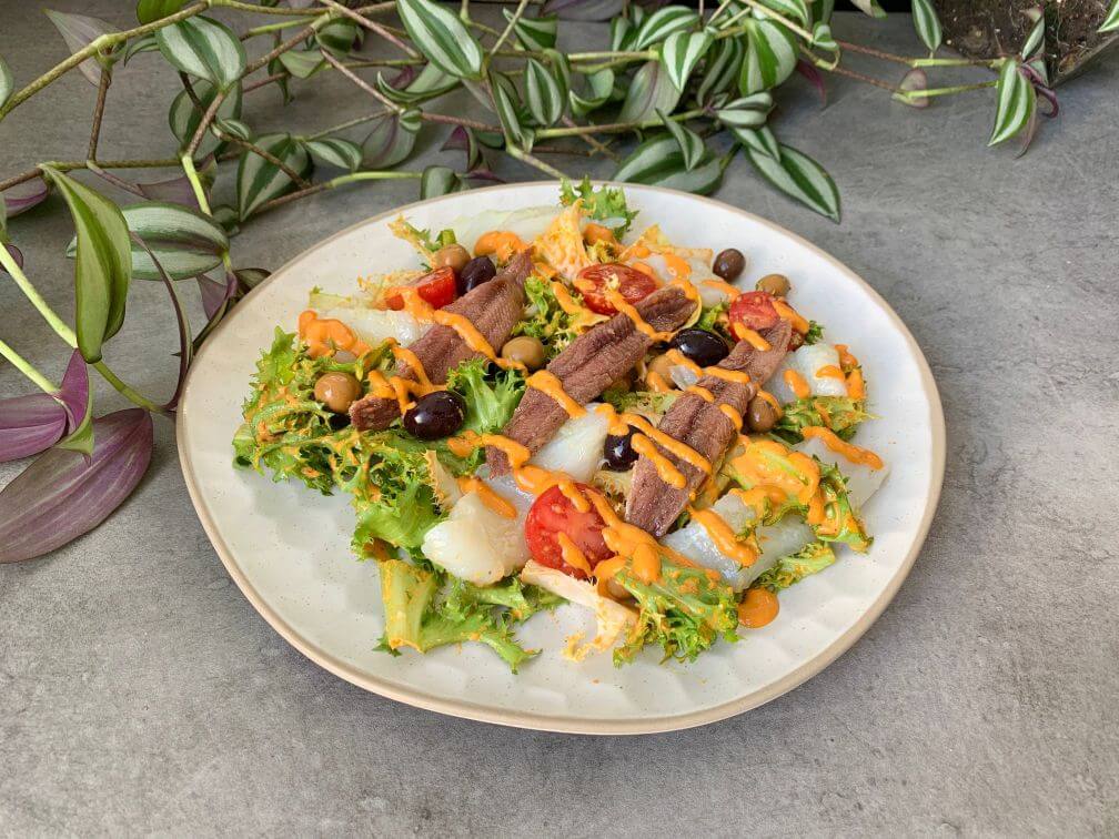 La XATONADA es una receta tradicional de la zona del Penedés y el Garraf, en Cataluña. Se trata de una ensalada de escarola con anchoas, bacalao, tomate, aceitunas